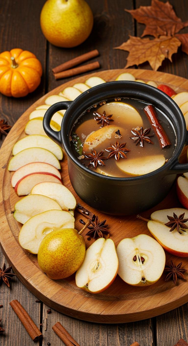 - Pour apple cider into a large pot and add maple syrup, cloves, and star anise.