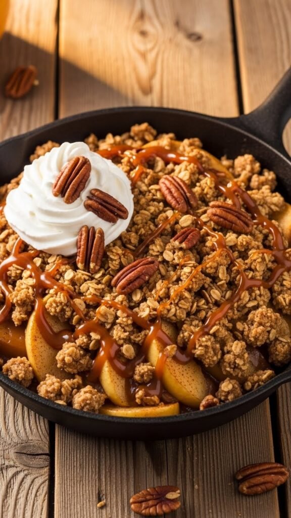 - Combine oats, flour, and butter to create topping; stir in chopped pecans. Layer the mixture over the apples.