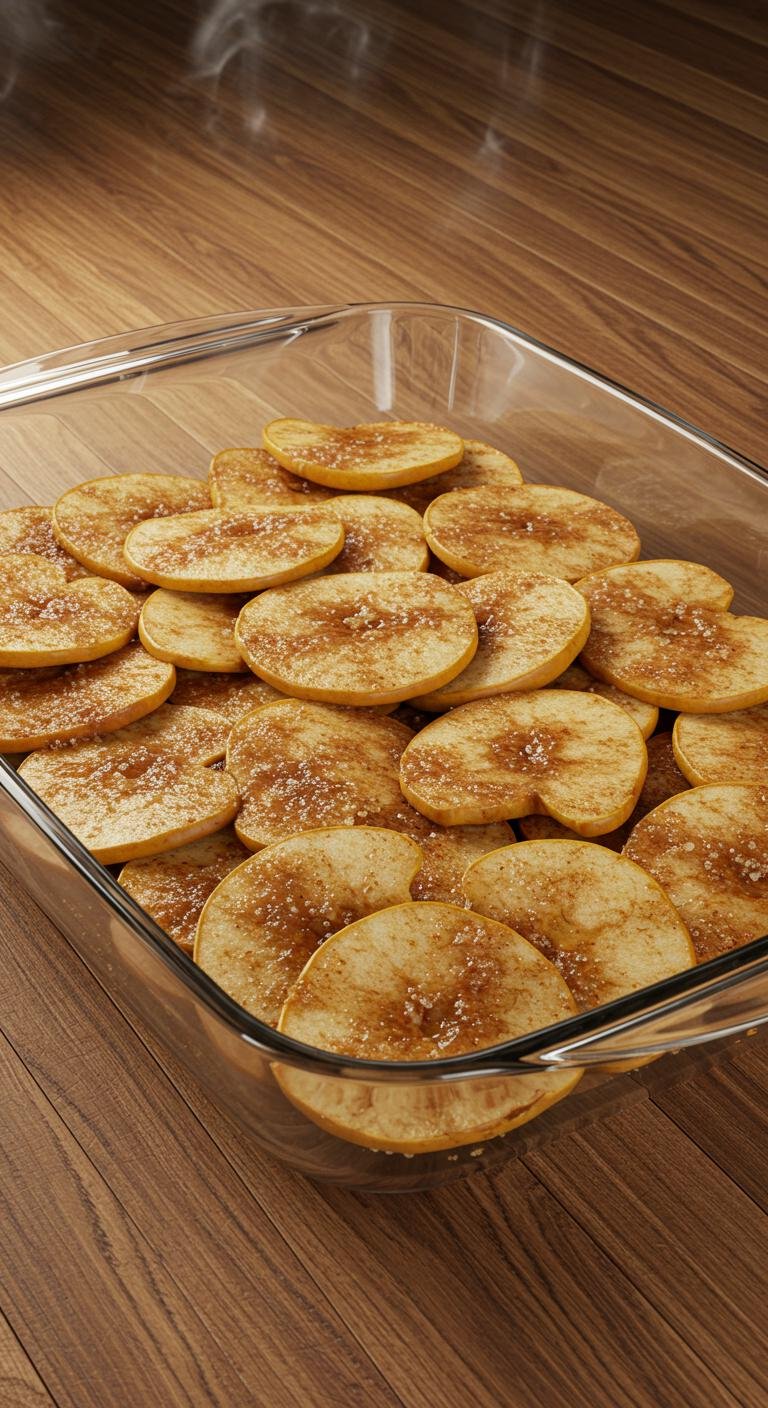 - Sprinkle the topping evenly over the apple layer, covering every juicy slice.