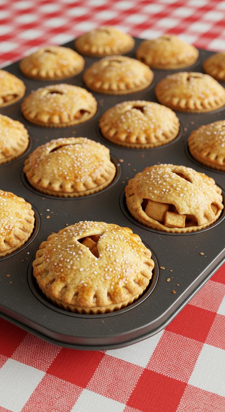 - Mix apples, sugar, and cinnamon; fill mini pie pans and top with crust.