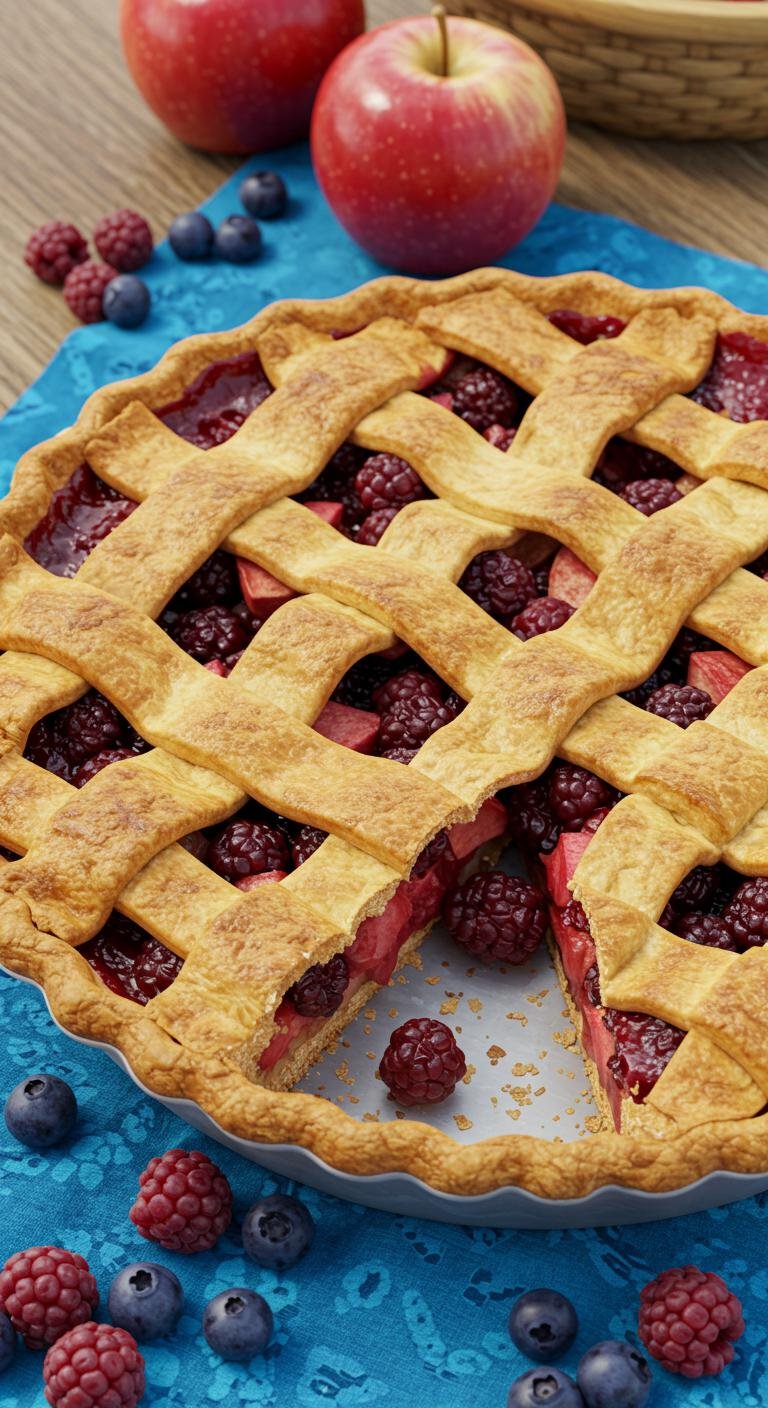 - Toss apples and berries with sugar and cornstarch; pour into bottom crust.