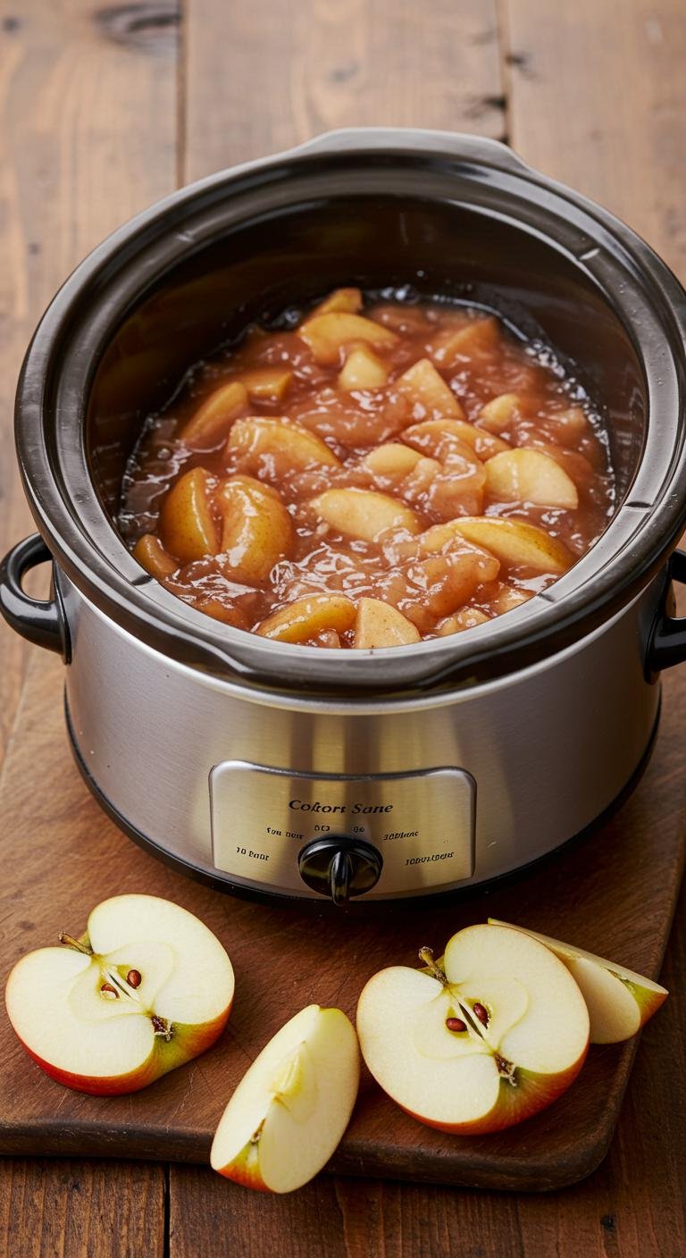 - Combine apples, sugar, and cinnamon in the slow cooker.