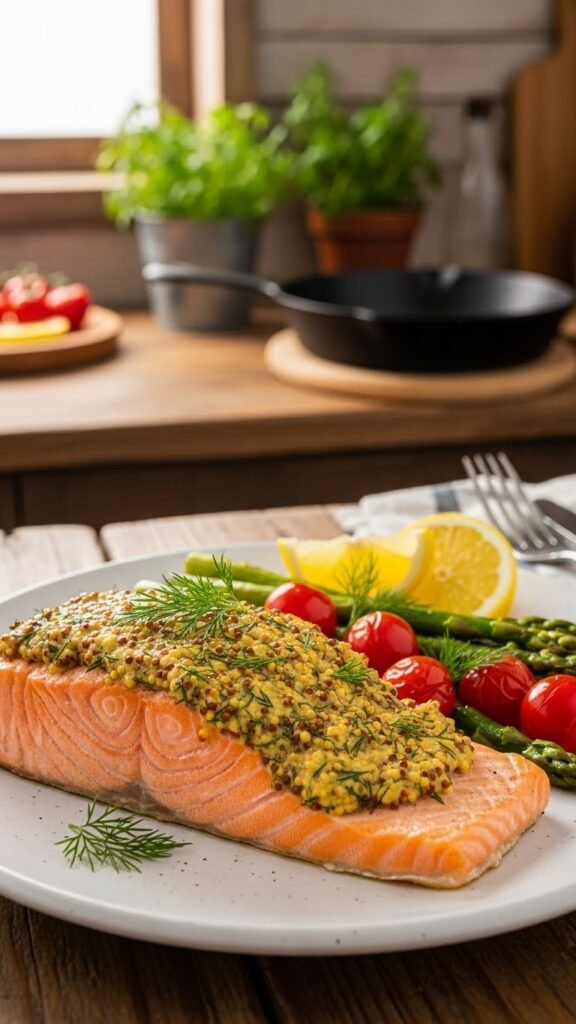 - Spread Dijon mustard over the salmon, sprinkle with dill, salt, and pepper.