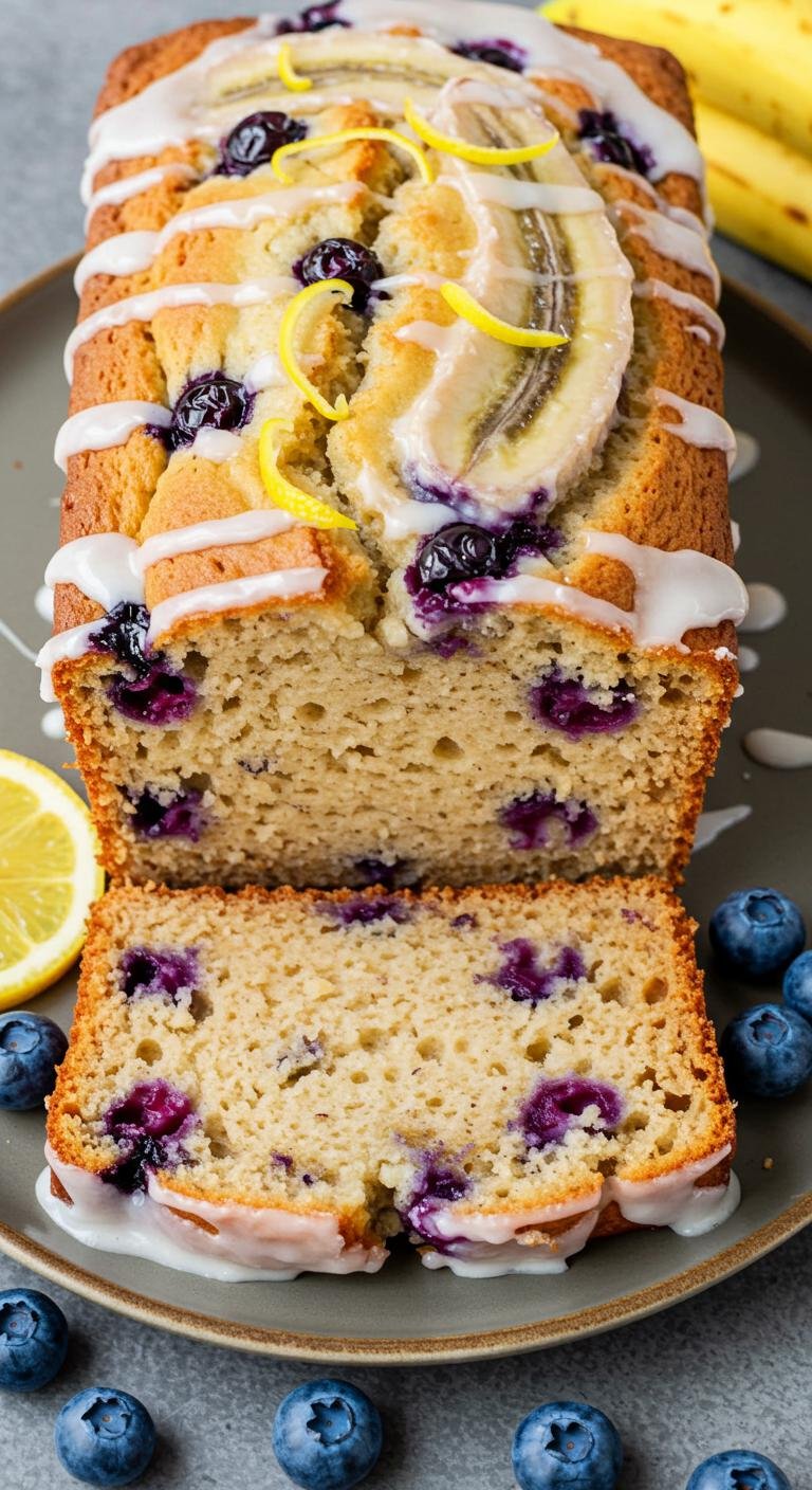 - Mix bananas, melted butter, sugar, egg, and vanilla. Stir in baking soda, flour, lemon zest, and blueberries.