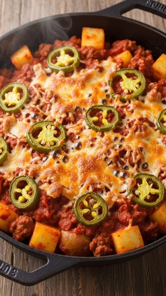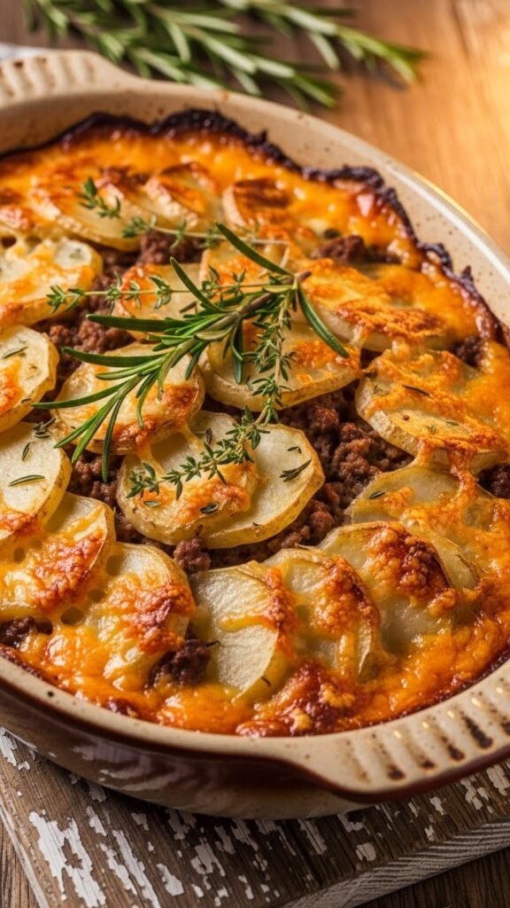 - Layer the diced potatoes in a baking dish, pour the beef mixture over, and top with cheese.