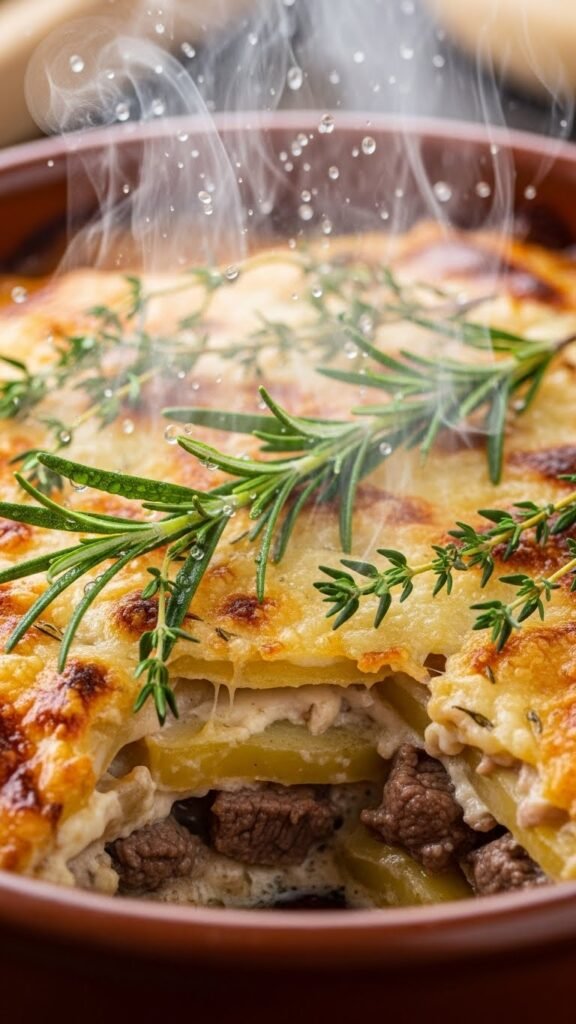 - In a baking dish, layer potatoes, beef, and cream mixed with herbs.