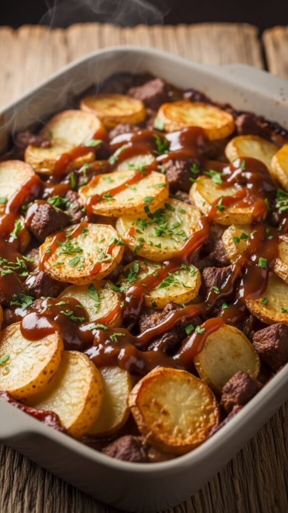 - Place cubed potatoes in a baking dish; layer beef and gravy on top.