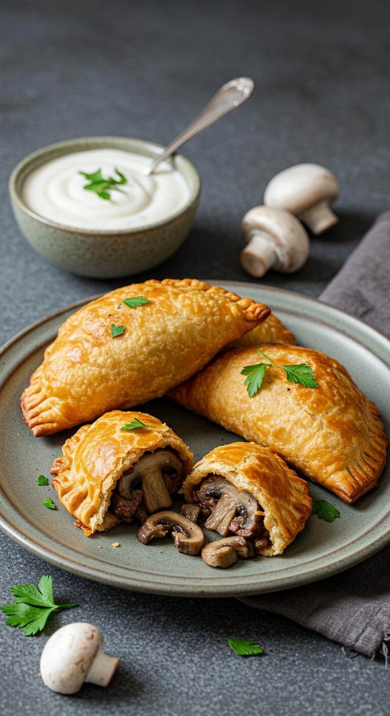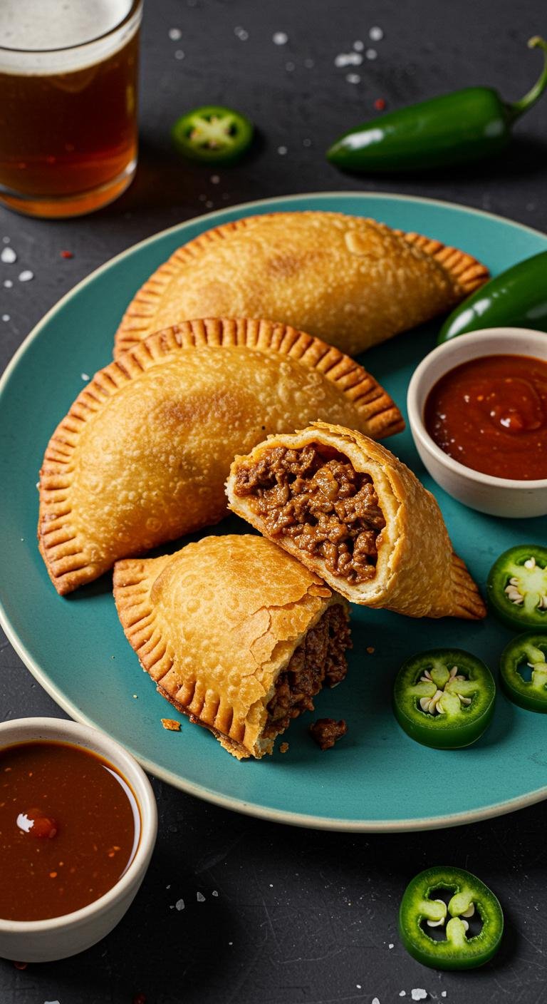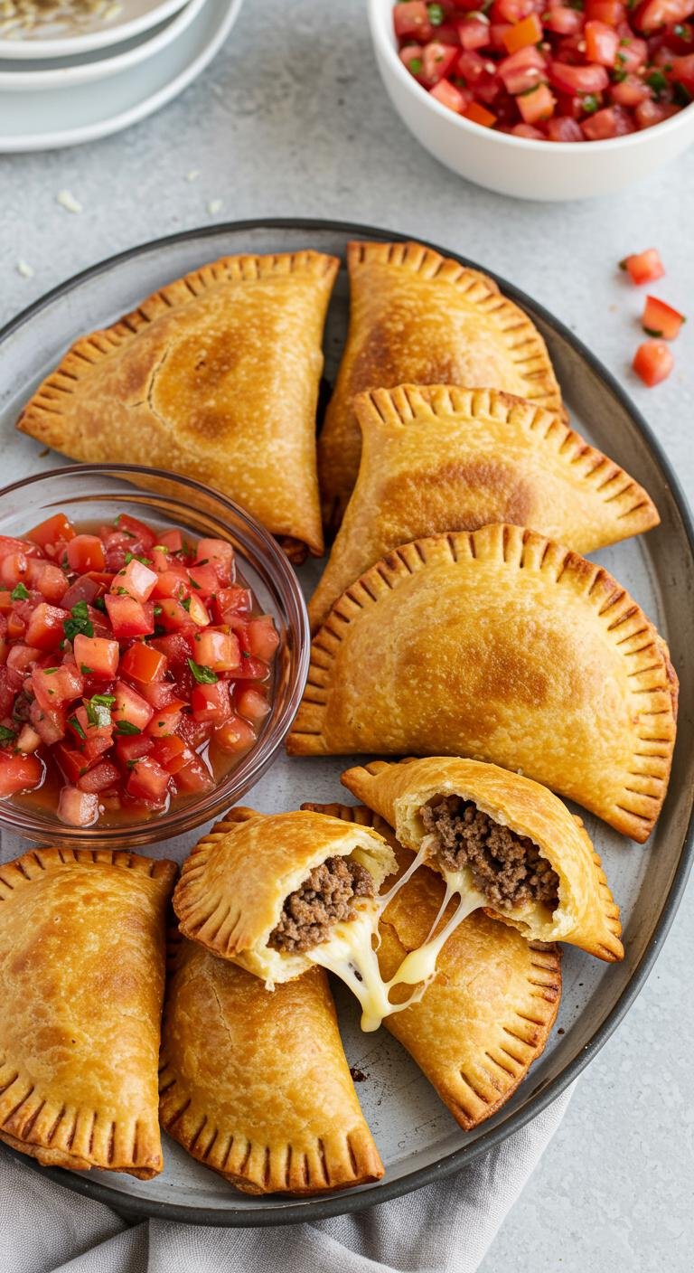 - Roll out dough, cut into circles, fill with beef mixture, fold, and seal. Bake at 375°F for 25 minutes.