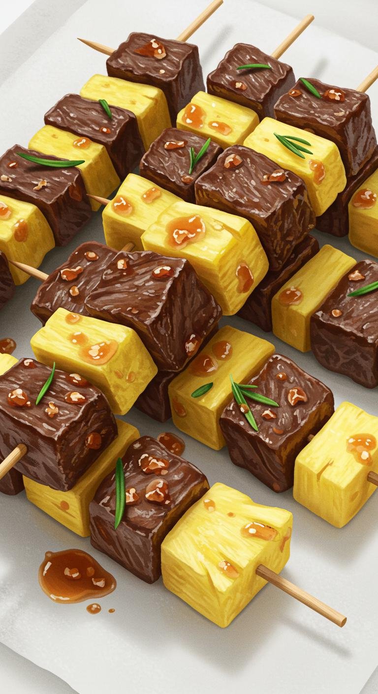 - Skewer beef, pineapple, and pepper. Grill until caramelized.