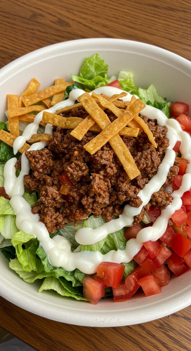 - In a large bowl, combine greens, tomatoes, and beef. Top with tortilla strips and dressing.
