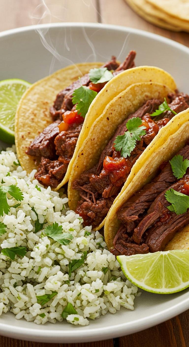 - Fill taco shells with beef and serve with cilantro-lime rice.