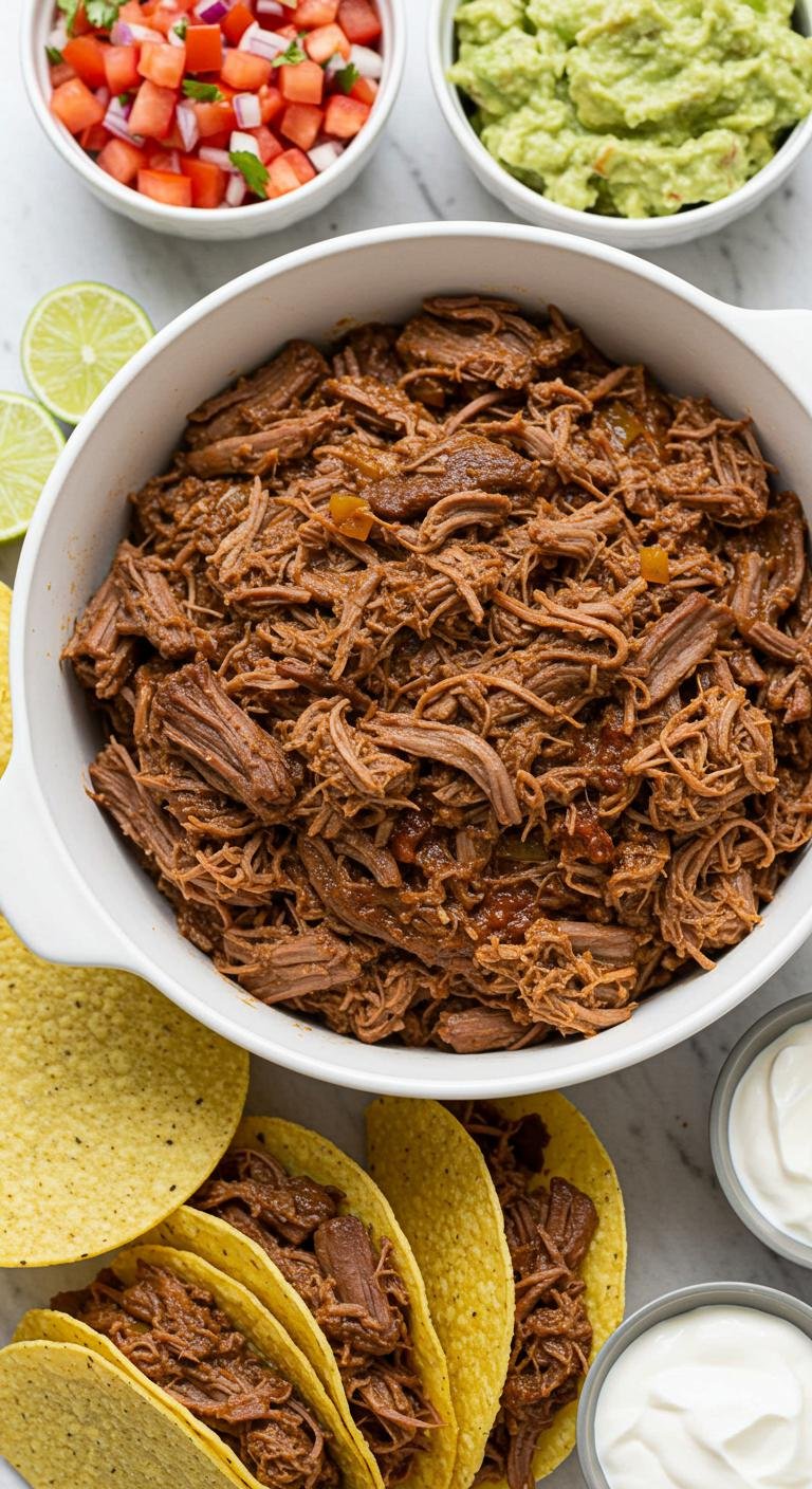 - Shred beef with forks and serve in taco shells with your favorite toppings.