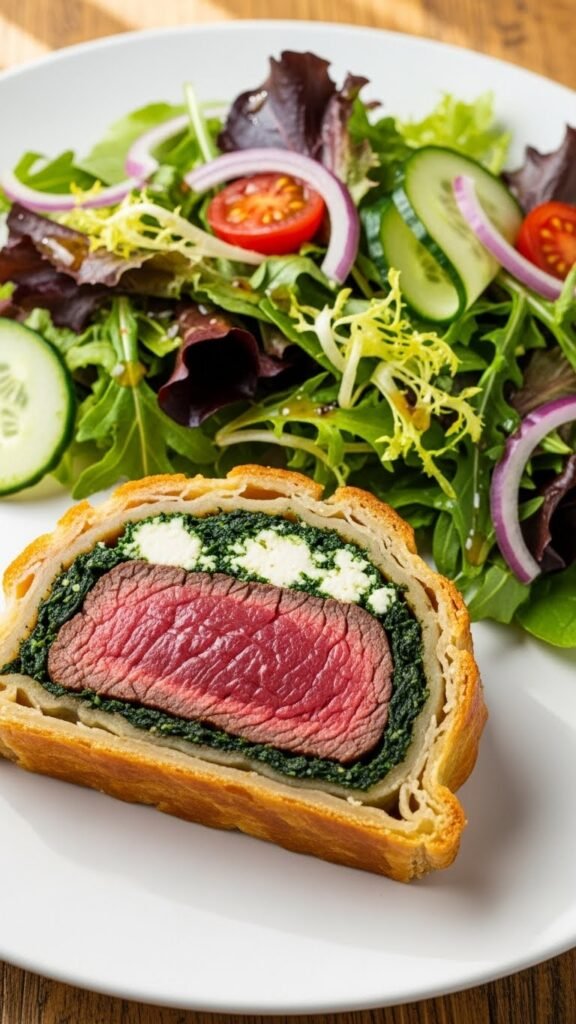 - Spread the spinach-feta mixture on the pastry, place the beef on top, and roll it up. Seal and brush with egg wash.