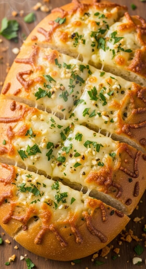 - Spread the mixture inside the sliced loaf and top with mozzarella.