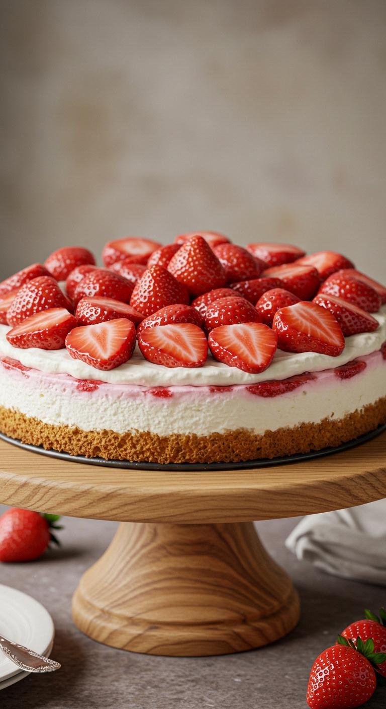 - Beat cream cheese and sugar until smooth. Add eggs and vanilla. Bake for 50-60 minutes, then top with sliced strawberries.