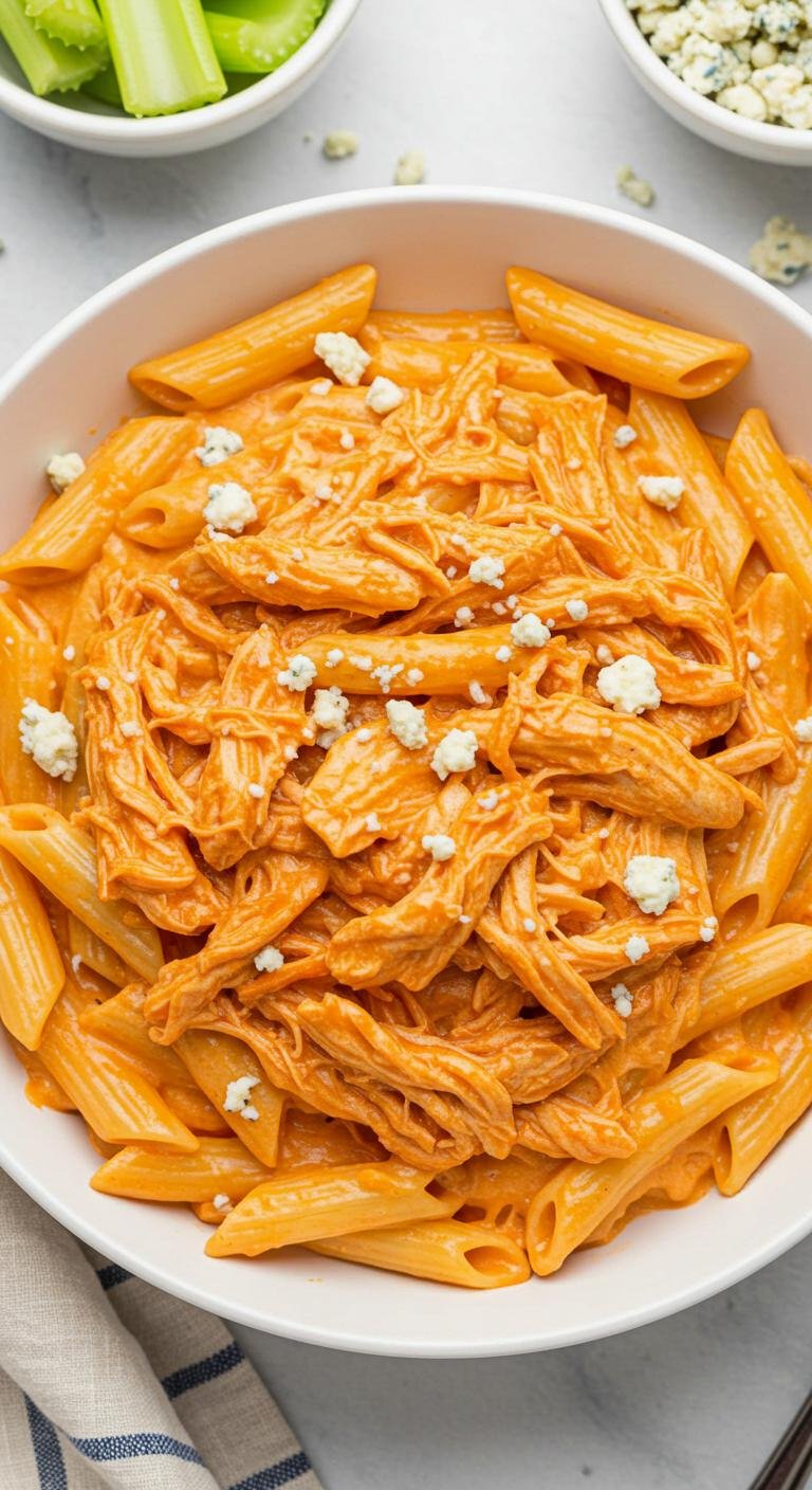 - In a skillet, melt butter, mix in cream and buffalo sauce. Stir in chicken and combine with pasta.