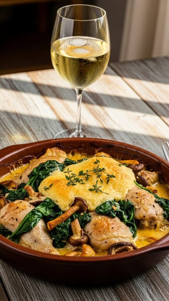 - Preheat oven to 350°F (175°C) and layer the chicken, mushrooms, and spinach in a baking dish.
