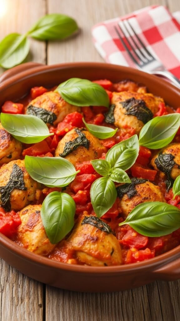 - Preheat oven to 350°F (175°C) and mix chicken, tomatoes, basil, and pasta in a bowl.
