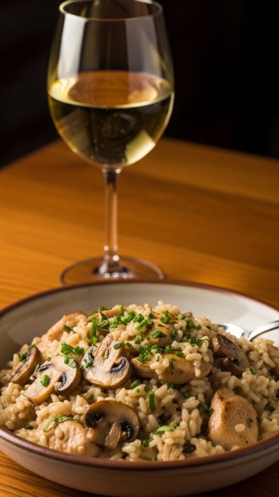- Add chicken and mushrooms; cook until chicken is done, then add Arborio rice.
