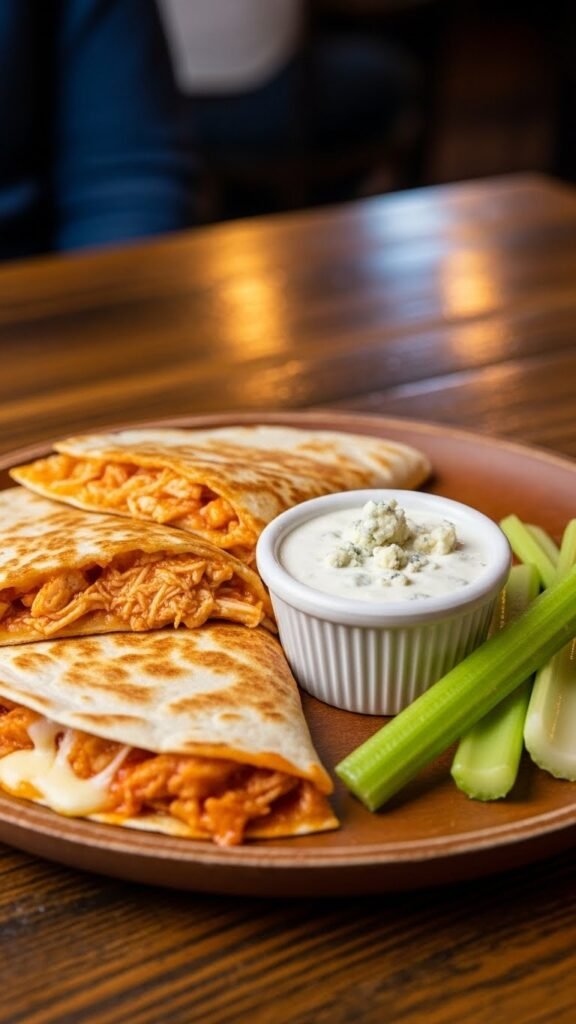 [Image Prompt: A spicy buffalo chicken quesadilla with fiery orange sauce seeping out, seated on a plate next to a creamy blue cheese dipping sauce and crunchy celery sticks, set in a lively gathering environment.]