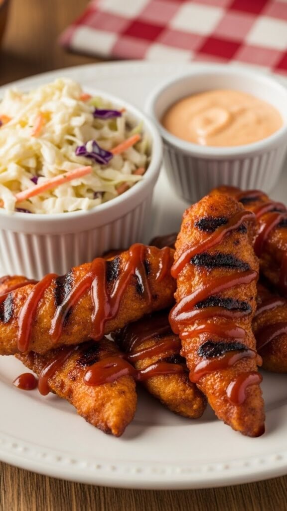 - Coat chicken strips in BBQ sauce and let marinate for 20 minutes.