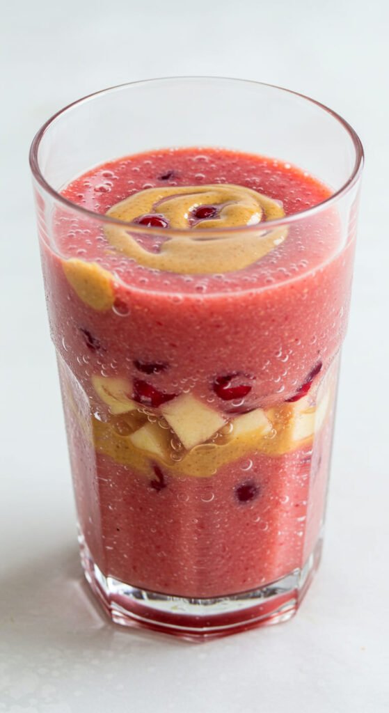 - Blend cranberries, apple, banana, cocoa powder, and almond milk.