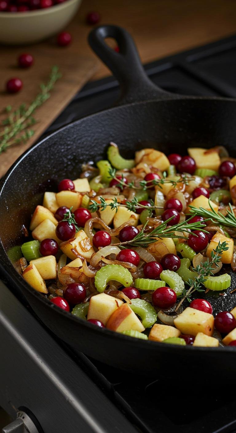 - Add diced apple, cranberries, and toasted nuts to the skillet; cook for 2-3 minutes.