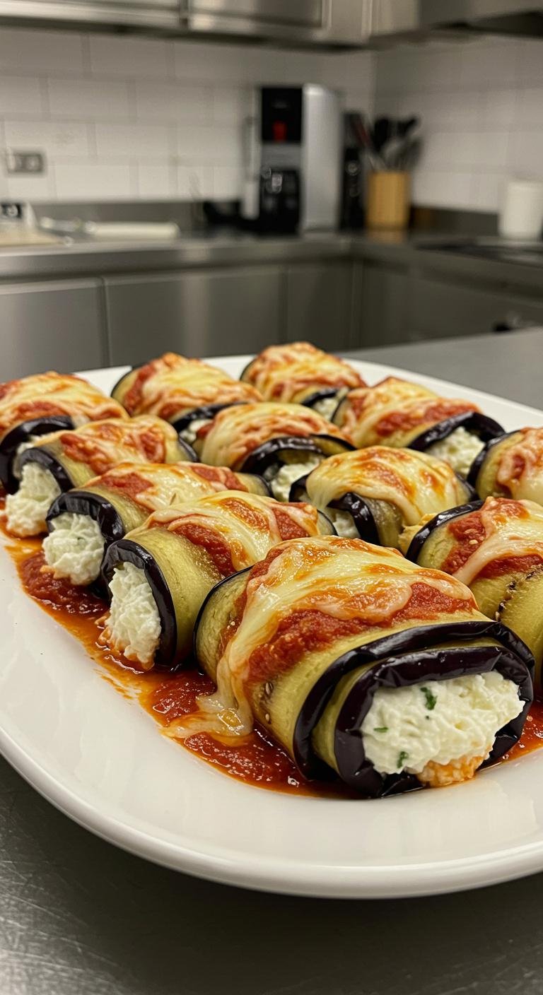- Fry sliced eggplants until golden, then layer in rolls with sauce and cheese.