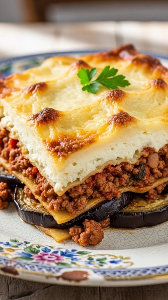 - Layer eggplant, meat, and béchamel in a baking dish. Repeat layers and finish with béchamel.