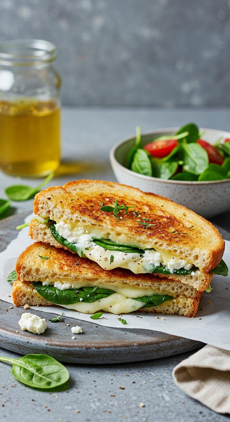 - Butter one side of each bread slice and layer feta and spinach in between.