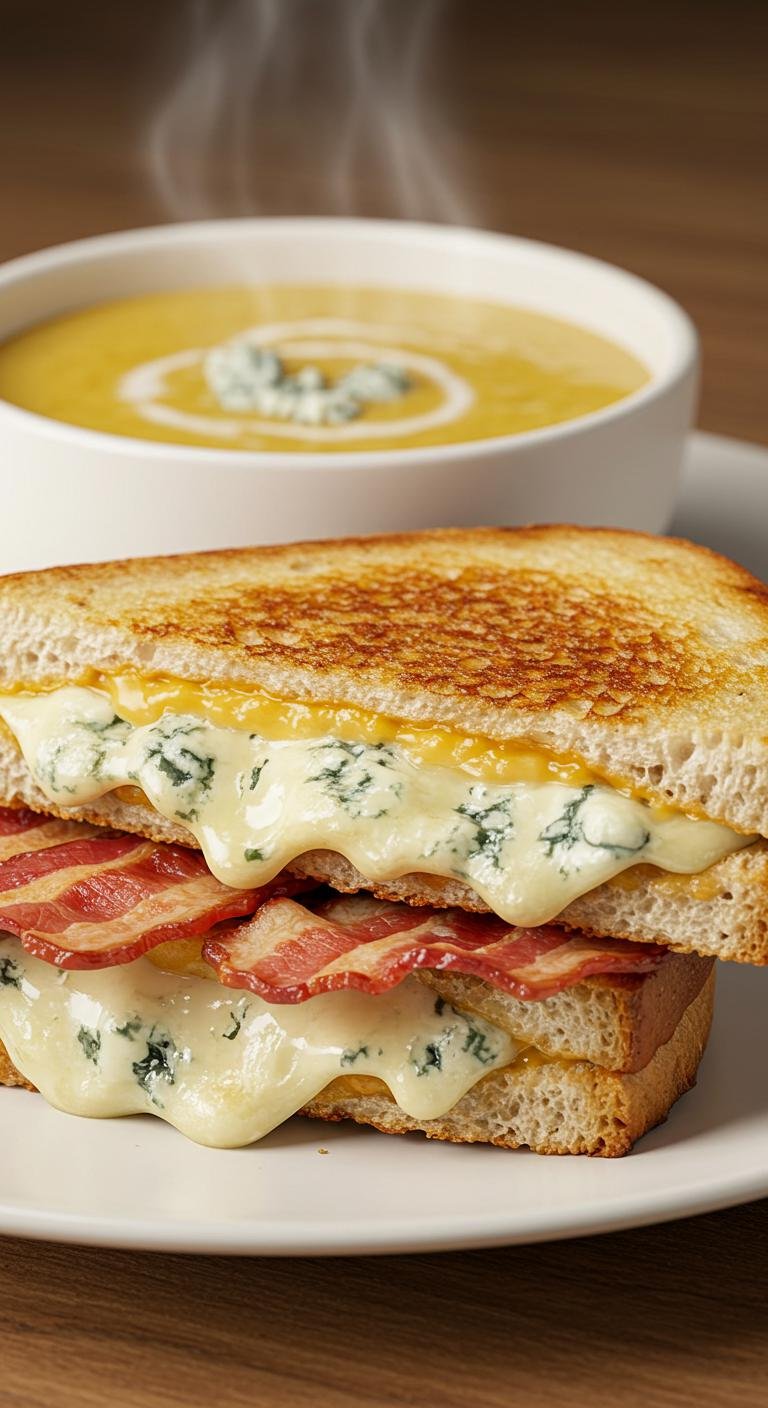 - Layer blue cheese and bacon between slices of bread.