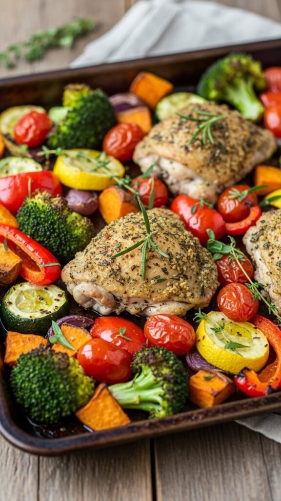 - Preheat oven to 425°F (220°C). Toss chicken and vegetables with olive oil, herbs, salt, and pepper.