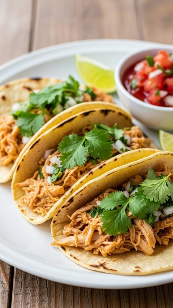 - Fill taco shells with chicken and top with salsa and lime.