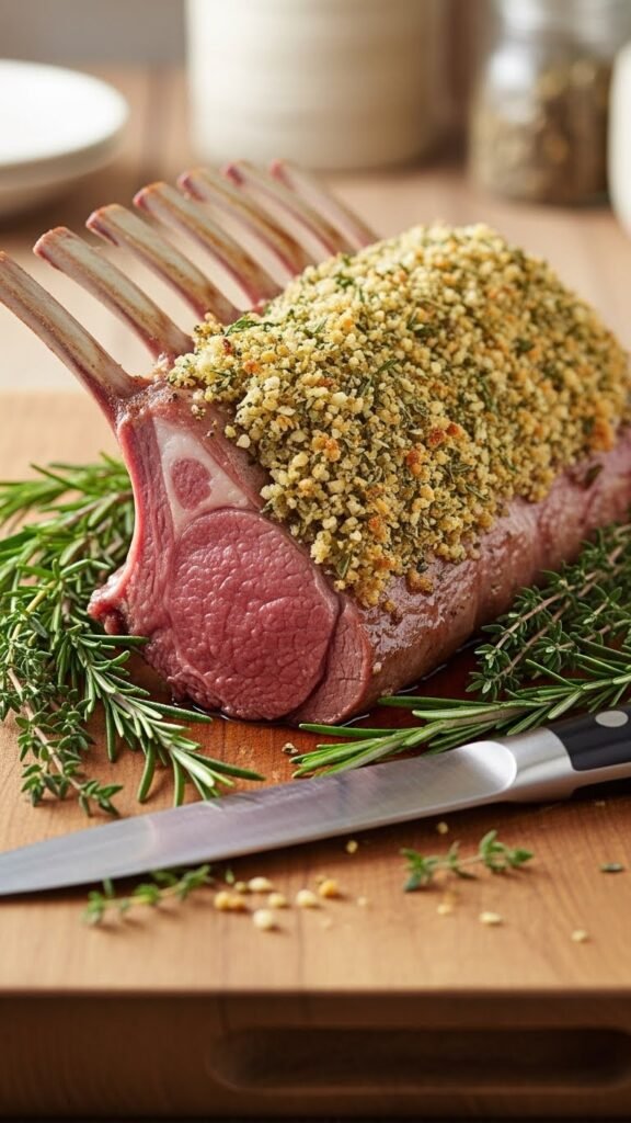 - Blend herbs, garlic, and breadcrumbs; coat the lamb.