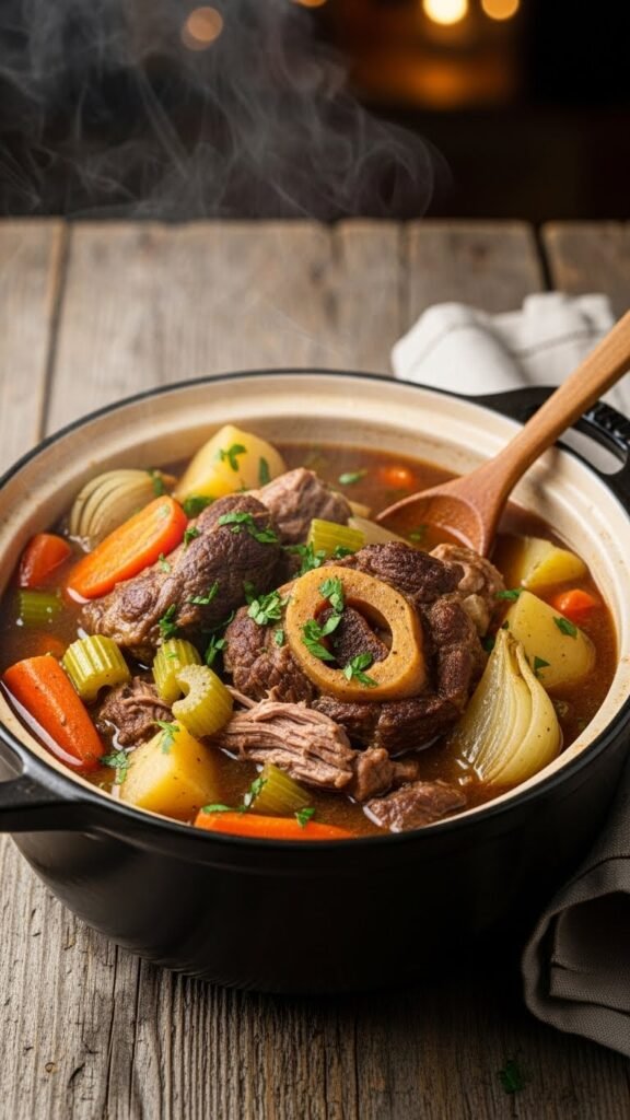 - Return shanks to the pot, cover, and braise for 2-3 hours.