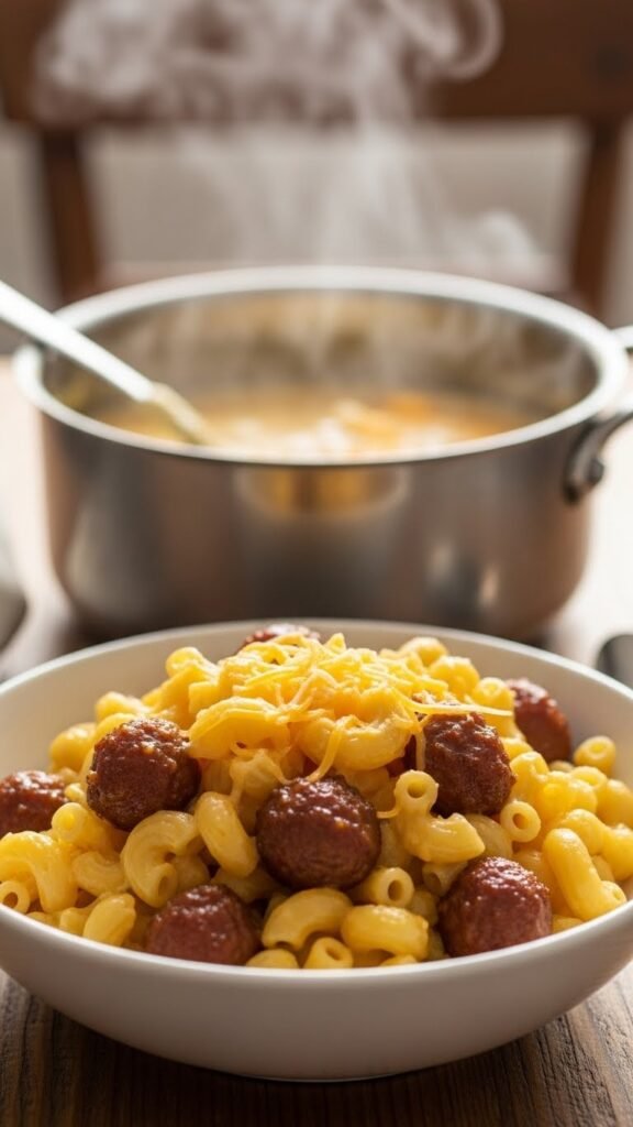 - In a pot, mix milk and cheese until melted, then combine with pasta and sausage.