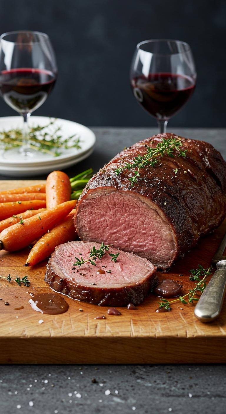 - Sear the roast; add wine, broth, veggies, and thyme in a Dutch oven.