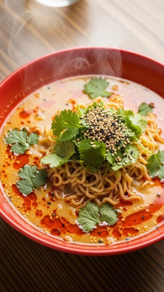 - Cook ramen noodles, then add to the broth along with chili oil.