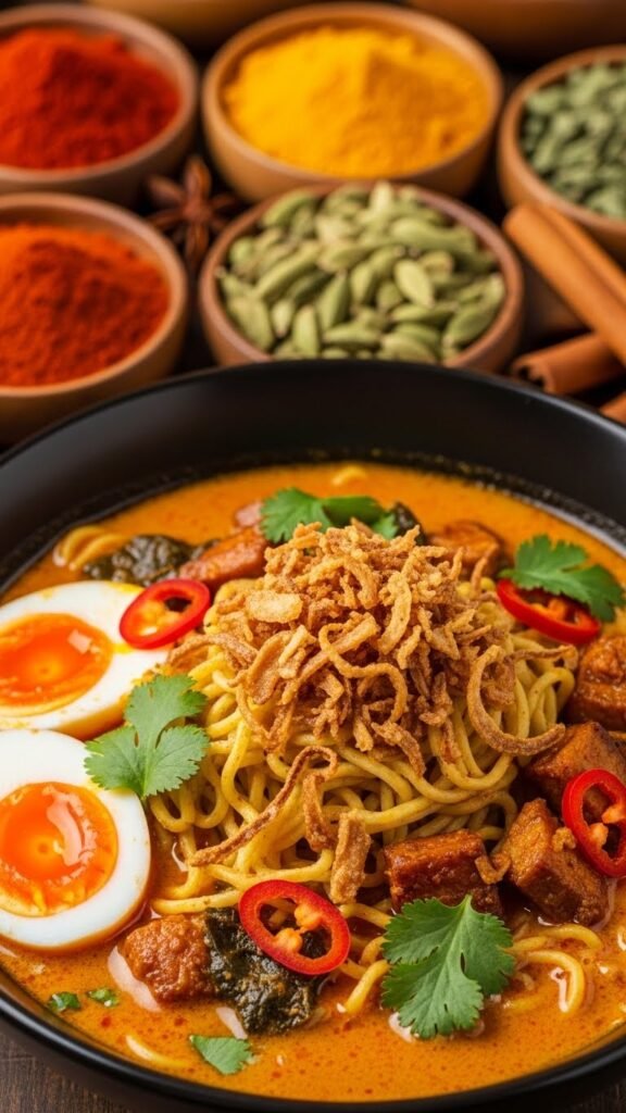 - Serve noodles in a bowl, pour the curry broth on top, and garnish.