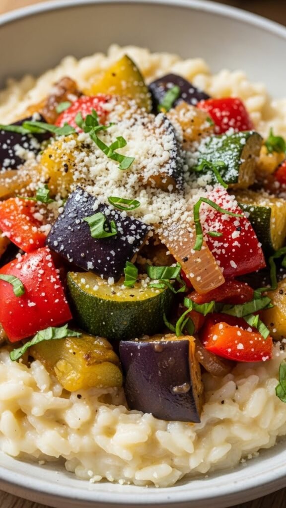 - Gradually stir in broth, followed by ratatouille until creamy.