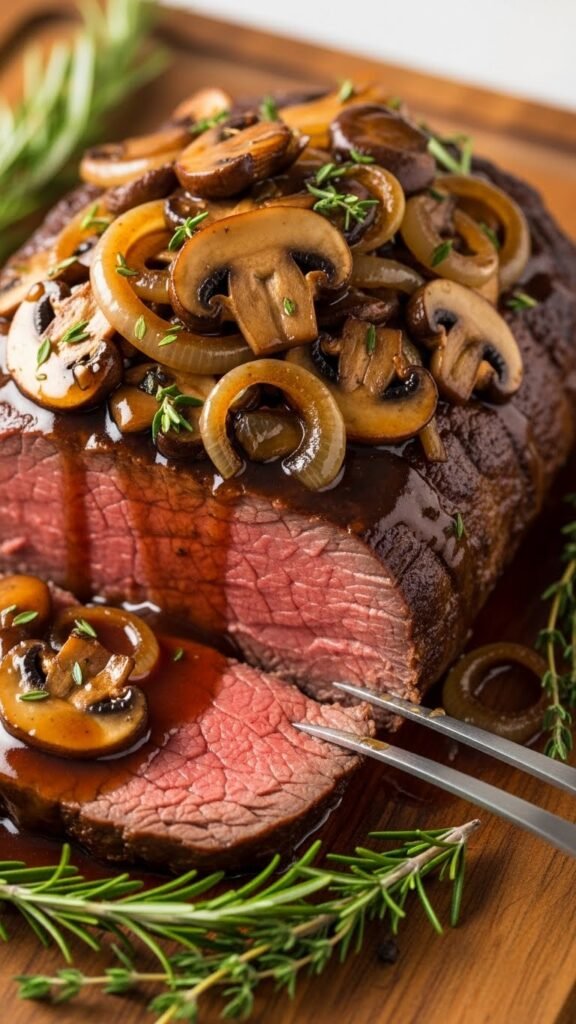 - In the same pan, sauté onions and mushrooms in butter until soft. Add broth and return the roast to the pan.