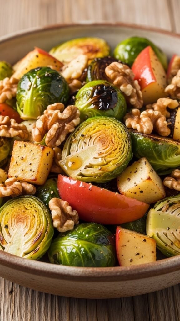 - Combine Brussels sprouts, apple, walnuts, olive oil, salt, and pepper in a bowl.
