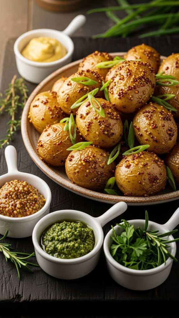 - Toss potatoes with olive oil, mustard, salt, and pepper. Arrange on a baking sheet.