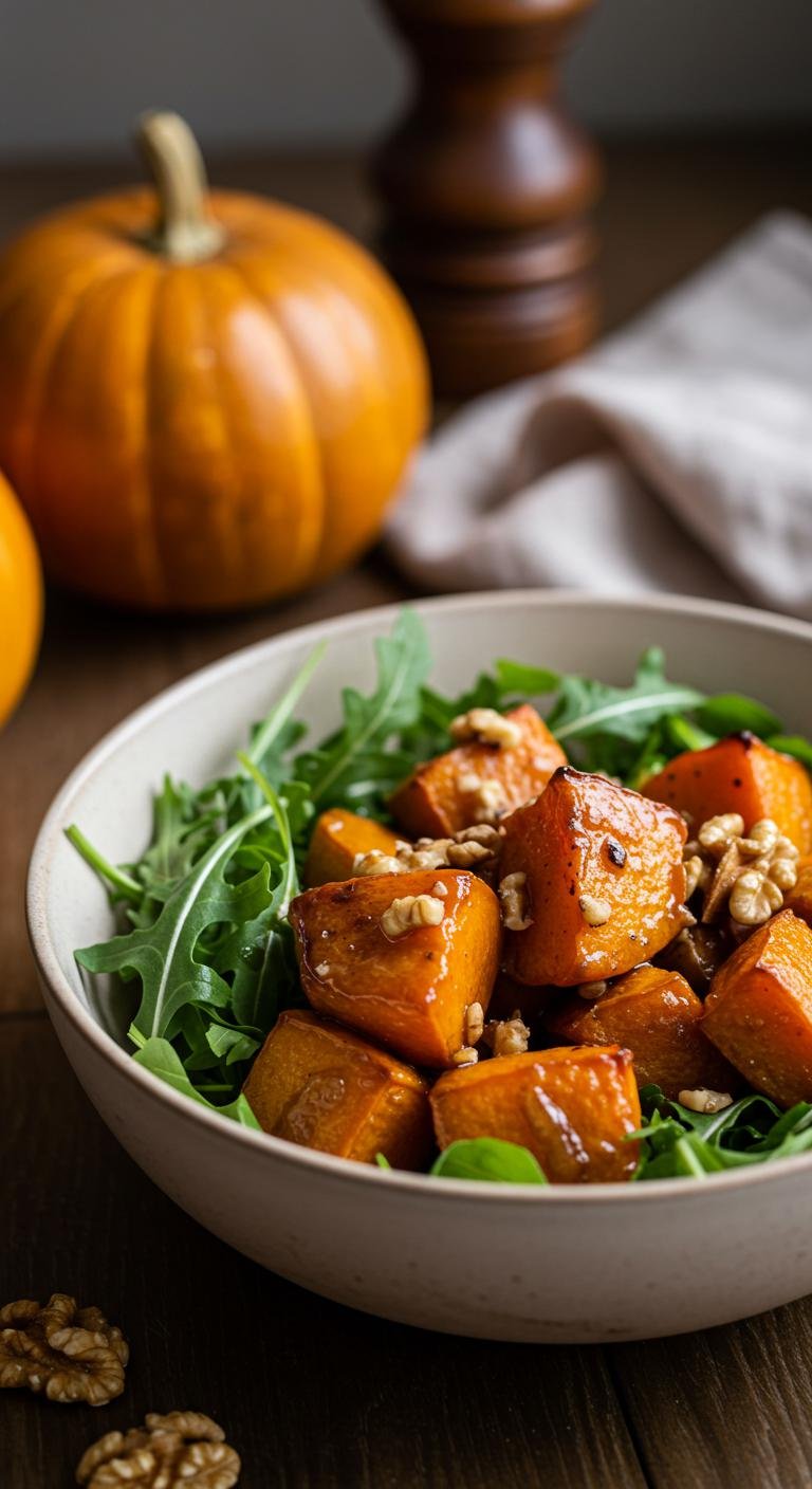 - In a bowl, combine arugula, roasted pumpkin, and walnuts.