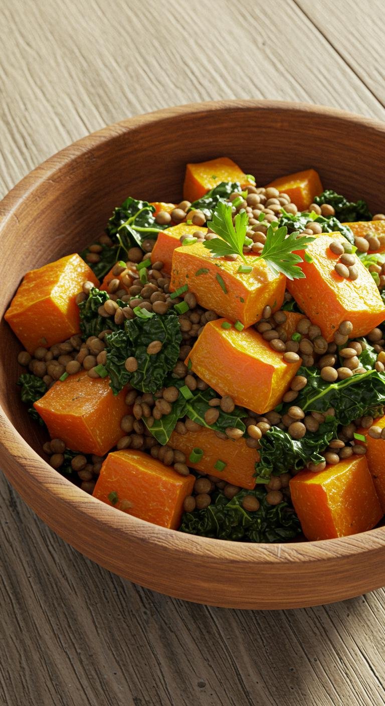 - Mix lentils, roasted pumpkin, and kale; dress with olive oil and vinegar.