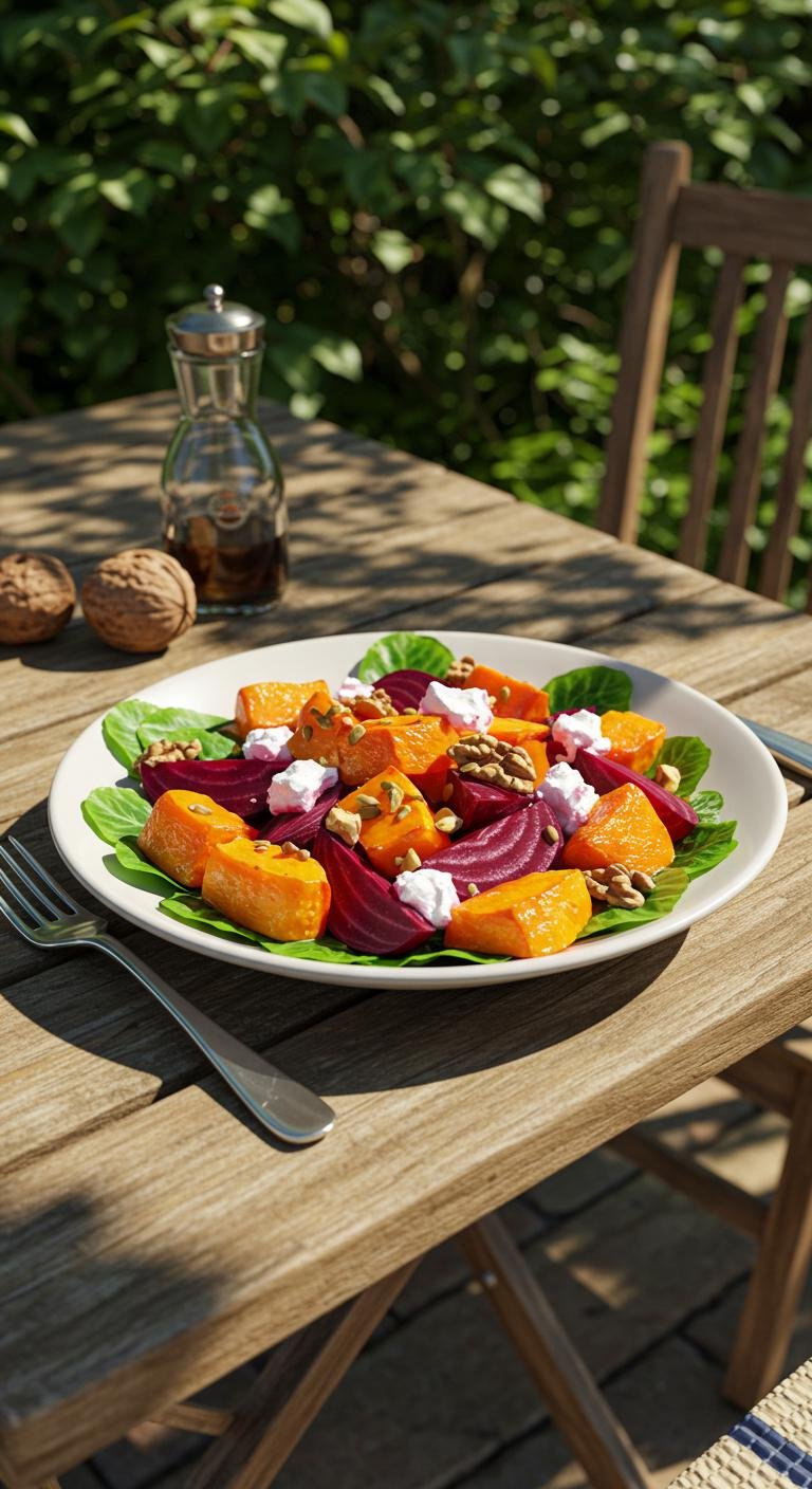 - Toss arugula, roasted pumpkin, beets, goat cheese, and walnuts in a bowl.