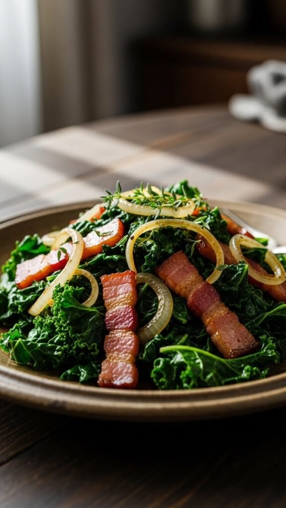 - In the bacon fat, sauté onions until caramelized, then add kale.