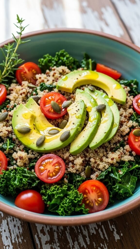 - In a large bowl, combine kale, quinoa, and tomatoes.
