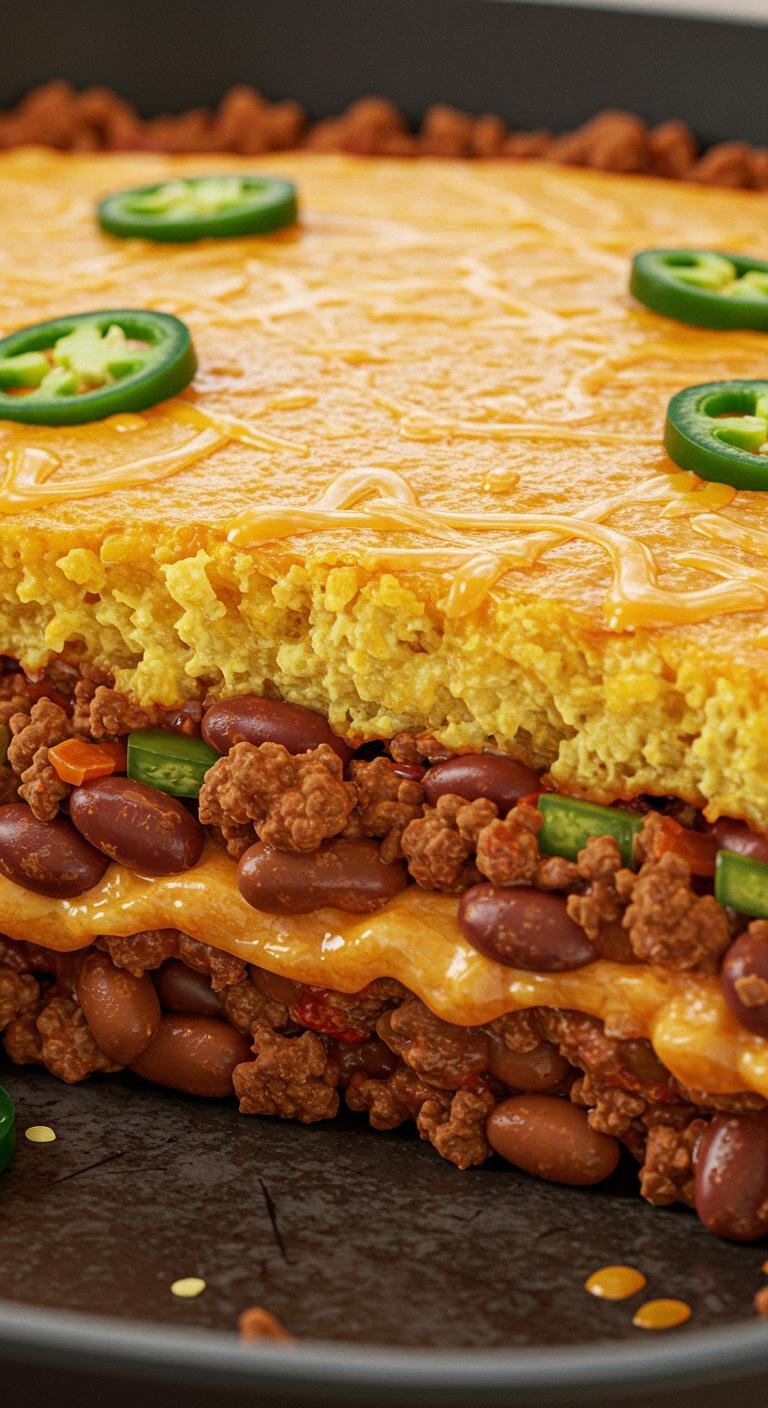 - Transfer to a baking dish and cover with cornbread batter.