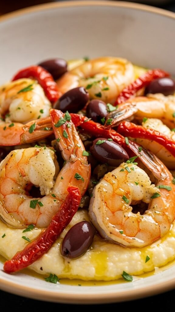 - Sauté shrimp with sun-dried tomatoes and olives until cooked.